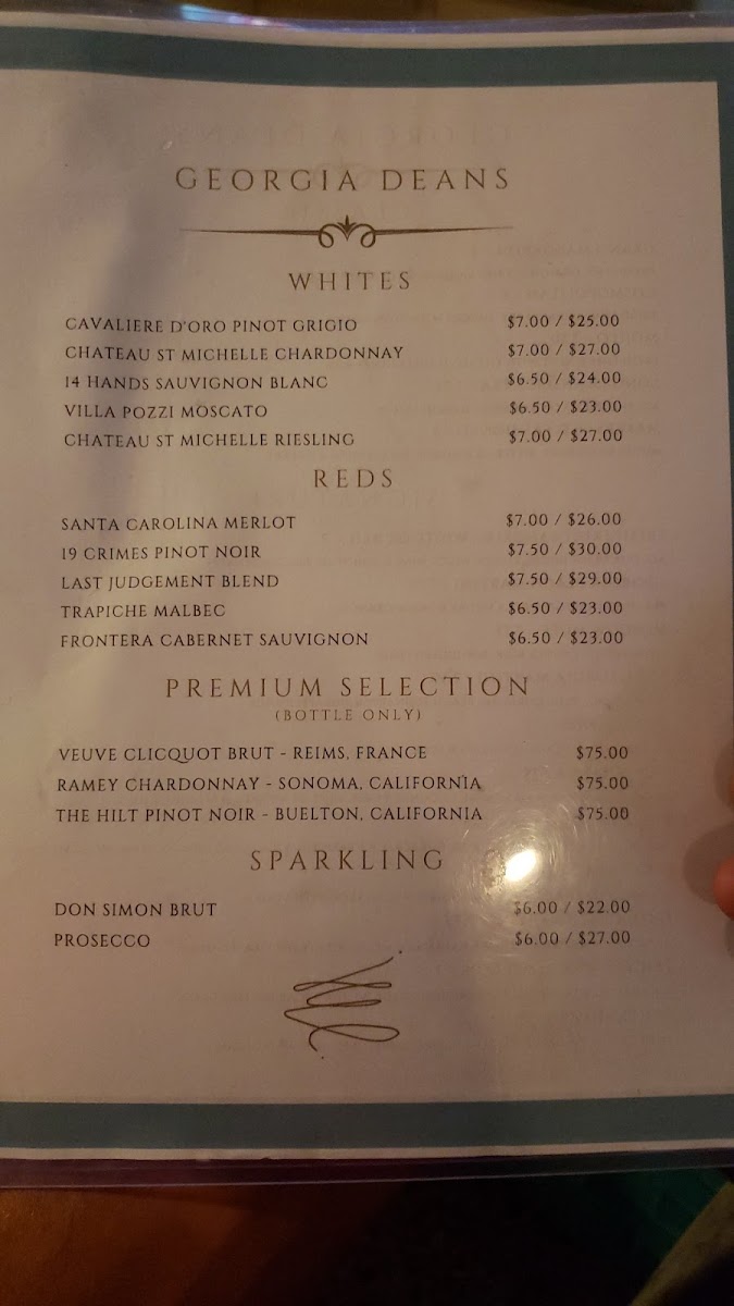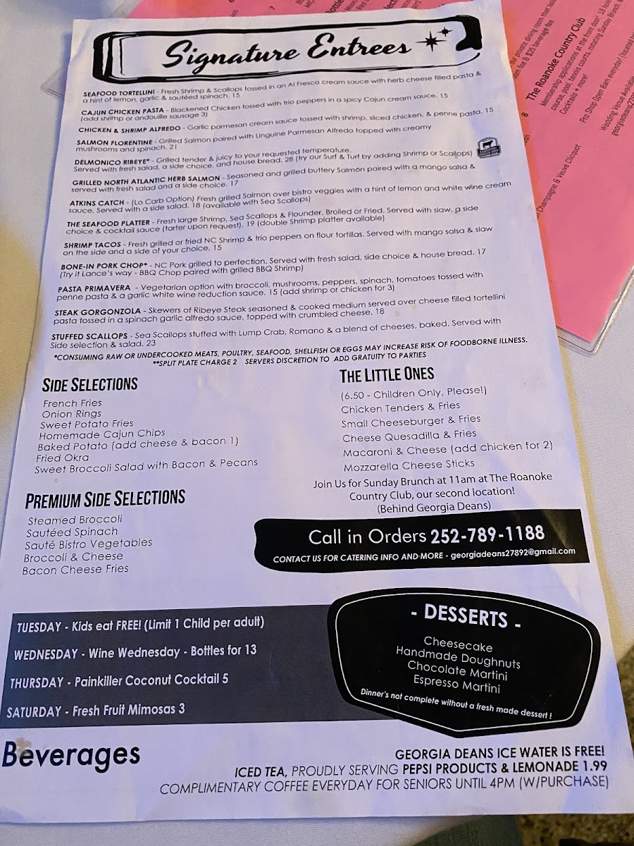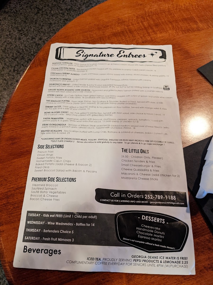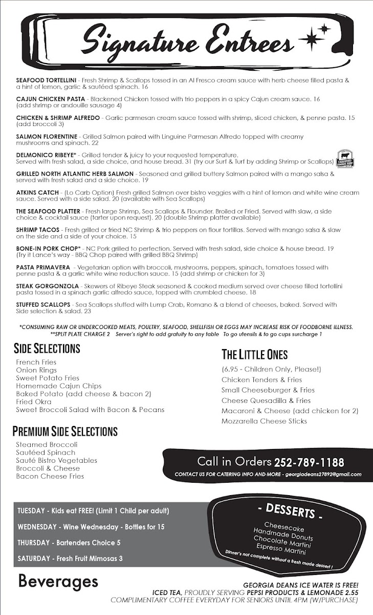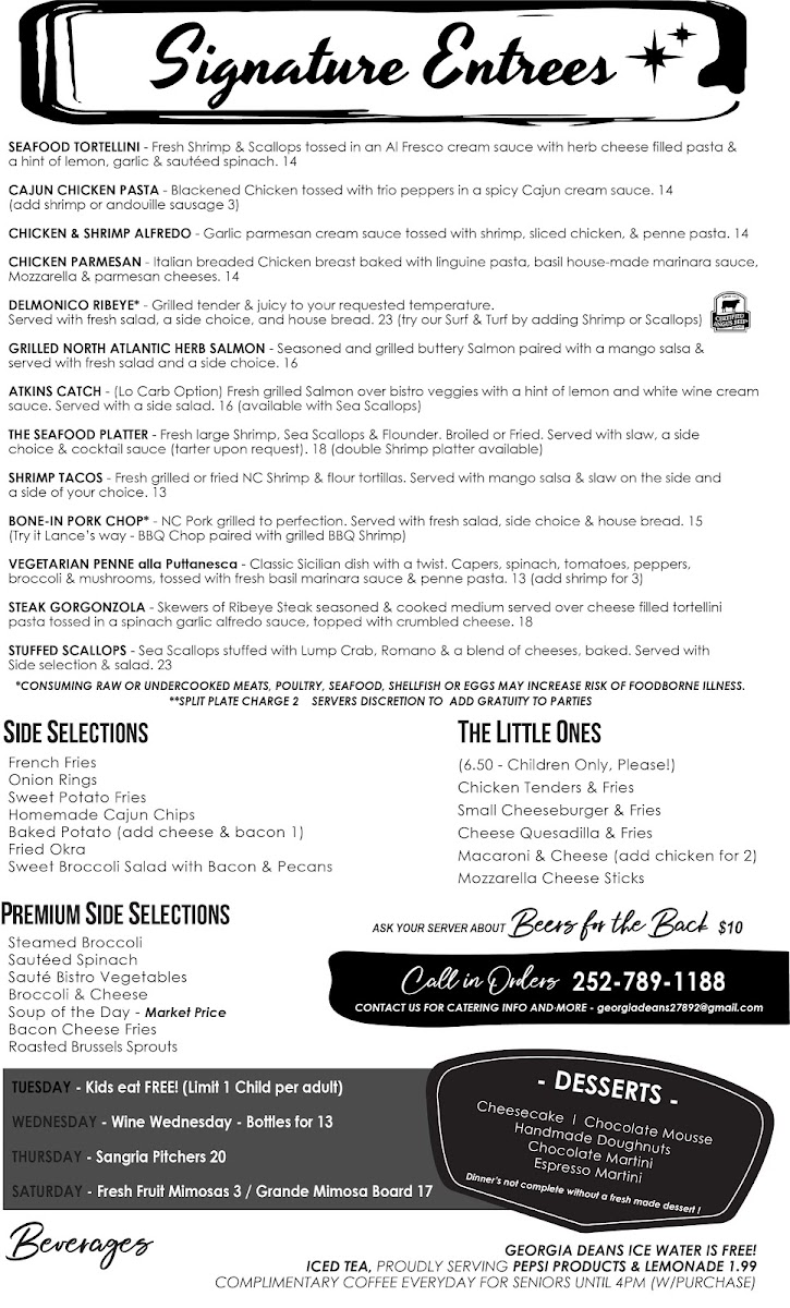 Welcome to Georgia Deans Restaurant & Bar, where every dish tells a story and each bite is a delightful experience waiting to unfold. Nestled at 1940 US-17 BUS, Williamston, NC, our menu boasts an enticing array of specialties that cater to all tastes. Dive into our Seafood Platter, a fresh-caught feast featuring everything from succulent crab cakes to broiled seafood, perfectly paired with sweet potato fries and coleslaw. Don't miss the crispy Fried Green Tomatoes, a local favorite that tantalizes your taste buds. For a heartier option, our Cajun Chicken Pasta promises a burst of flavor with every spoonful. Pair your meal with refreshing Margaritas or our signature Sangria for a truly indulgent evening. And for those with a sweet tooth, our homemade donuts and rich Chocolate Mousse are must-tries. Join us for a culinary journey that will leave you craving more!